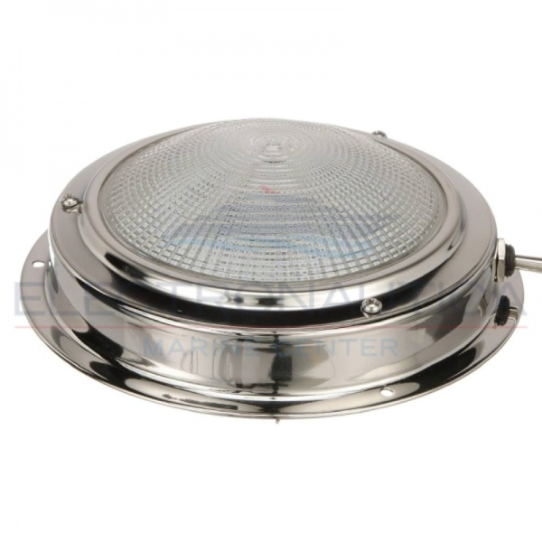 Luz de cabina LED blanca brillante de acero inoxidable altamente pulido. Lente de vidrio de patrón transparente de festón resistente. Interruptor de palanca de acero inoxidable incorporado.